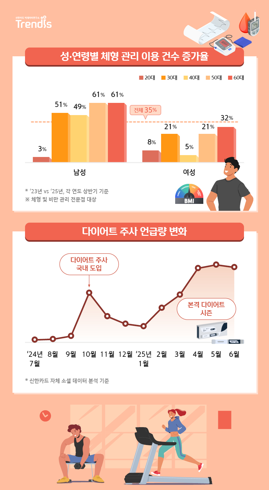 마지막으로 전문가의 도움을 받아 살을 빼거나 체형을 관리하려는 움직임도 자기관리의 한 형태로 등장하고 있는데요. 이와 관련해 체형·비만 관리 전문점의 이용이 증가하고 있고요. 특히 남성 소비층의 증가율이 두드러집니다. 또한 국내에도 다이어트 주사가 상용화되기 시작해 최근 1년간 인플루언서를 중심으로 실제 경험, 효과 등이 공유되며 언급량도 눈에 띄게 증가했는데요. 꾸준한 관리도 중요하지만 시간과 에너지를 효율적으로 투자해 성공적인 다이어트와 체형 관리를 하고자 하는 실용적인 자기관리 성향이 나타나고 있는 것 아닐까요.