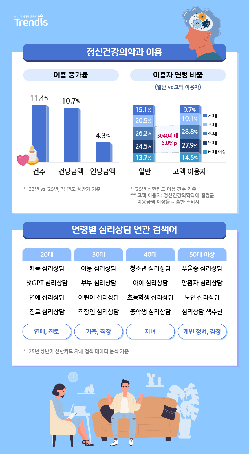 이와 더불어 ‘심리상담’에 대한 검색 데이터를 통해서는 연령별 마음 관리 관심사를 살펴보았는데요. 20대는 연애나 진로 고민, 30~40대는 가족 및 직장 내 갈등, 50대 이상은 개인의 정서와 감정 관리에 대한 관심이 높은 것으로 나타나, 세대별로 주요 고민 영역이 다르다는 것도 확인할 수 있었습니다. 정신건강관리는 이제 더 이상 소수의 사람들만 하는 치료 영역이 아닌 일상적으로 관리하고 케어해야 하는 예방적 차원의 건강관리로 인식이 변화하고 있는 것 같네요.