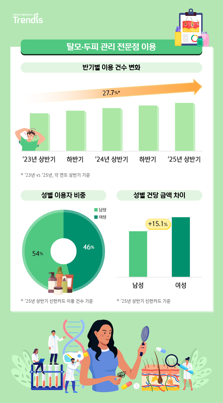 요즘은 피부관리에서 한 단계 더 나아가 두피/모발까지 세심하게 케어하려는 움직임도 나타나고 있는데요. 탈모/두피관리 전문점의 경우 ‘23년부터 이용 건수가 꾸준히 늘어나 약 27.7% 증가한 모습을 보이고 있고요. 이용 비중은 남성이 54%로 여성보다 많으나 건당 금액의 경우 여성이 남성 대비 15.1% 더 높아 두피 관리에 대한 관심이 성별 구분없이 넓어지고 있음을 확인할 수 있습니다. 탈모 고민 뿐만 아니라 두피 건강, 헤어라인 정리를 통해 깔끔한 이미지를 얻기 위한 노력이 여성들 사이에서도 나타나고 있음을 짐작해볼 수 있네요.