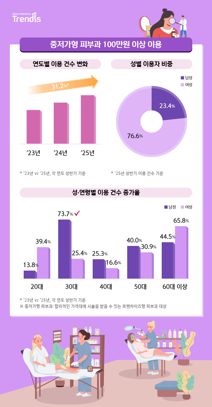 그렇다면 자기관리의 주요 영역으로 나타난 피부관리 쪽은 어떨까요. 피부과 입문자들이 많이 방문하는 중저가형 프랜차이즈 피부과의 경우