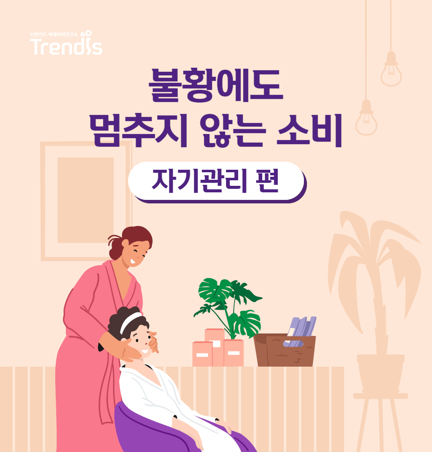 고물가, 지속되는 불황으로 인해 그 어느때 보다 지갑이 쉽게 열리지 않는 시기인데요. 주머니 사정이 어려울수록 선택과 집중을 통해 만족을 극대화하려는 움직임은 더욱 강해지는 것 같습니다. 소비의 선택과 집중이 중요해지는 시기, 신한카드 빅데이터연구소에서는 불황에도 불구하고 포기하지 못하는 소비 영역으로 자기 관리, 자녀 교육에 주목해 보았는데요. 우선 자기 관리 영역부터 살펴보겠습니다.