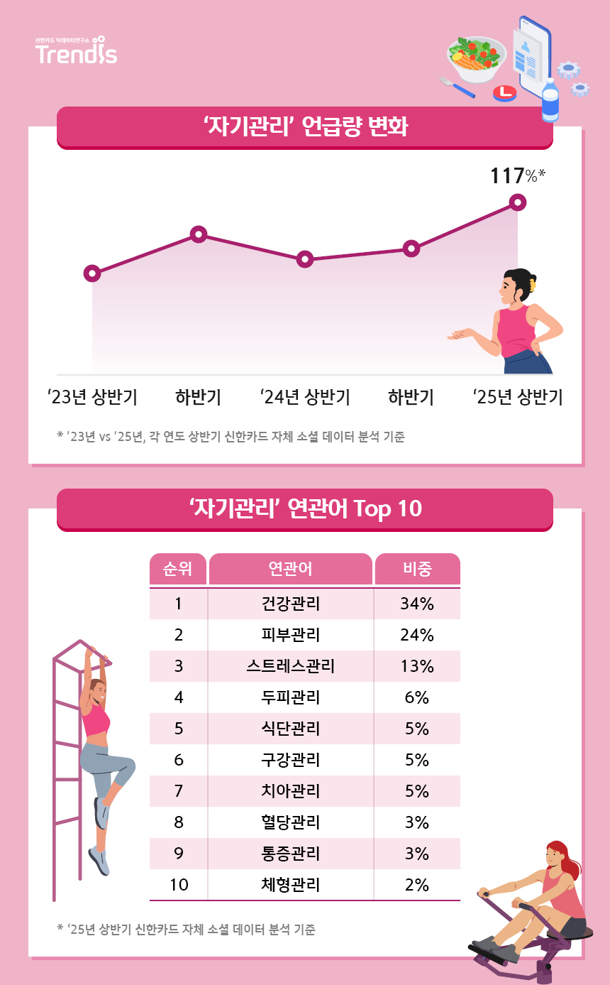 고물가, 지속되는 불황으로 인해 그 어느때 보다 지갑이 쉽게 열리지 않는 시기인데요. 주머니 사정이 어려울수록 선택과 집중을 통해 만족을 극대화하려는 움직임은 더욱 강해지는 것 같습니다. 소비의 선택과 집중이 중요해지는 시기, 신한카드 빅데이터연구소에서는 불황에도 불구하고 포기하지 못하는 소비 영역으로 자기 관리, 자녀 교육에 주목해 보았는데요. 우선 자기 관리 영역부터 살펴보겠습니다.