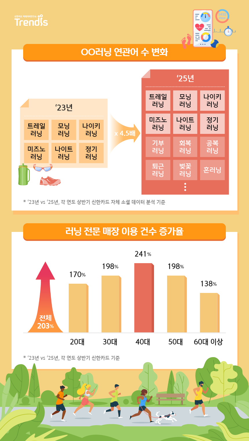 우선 요즘 건강을 위한 루틴 중 가장 눈에 띄는 변화는 단연 ‘러닝’에 대한 관심입니다. 특별한 장비 없이도 누구나 쉽게 시작할 수 있어 가성비 높은 자기관리로 주목받고 있는데요. 실제 SNS상에서 ‘러닝’ 관련 키워드 수는 최근 2년 사이 약 4.5배 증가하였고, 상황/시간대/테마와 연결된 다양한 연관 키워드도 새롭게 등장했습니다. 또한 러닝에 대한 높은 관심과 함께 러닝 전문 매장의 이용 건수도 2년 전 대비 눈에 띄는 증가율을 보였는데요. 연령별로 살펴보면 40대의 증가율이 가장 높긴 하지만 모든 연령층에서 이용이 증가해 세대 구분 없이 즐길 수 있는 일상 속 자기 관리이자 라이프스타일이 되고 있는 것 같습니다.