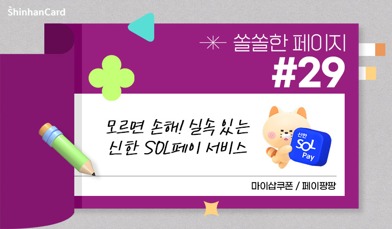 매일 쓰는 결제지만, 그 안에 숨어 있는 혜택까지 잘 챙기고 계신가요? 같은 소비라도 포인트가 쌓이고 할인 쿠폰도 챙겨 결제하는 똑똑한 방법이 있어요. 신한 SOL페이에서는 일상 속 결제에 실속 있는 혜택을 더해주는 다양한 서비스가 준비돼 있는데요. 그중에서도 오늘 소개할 건 바로, ‘마이샵 쿠폰’과 ‘페이팡팡’! 편하게 사용이 가능하지만 놓치기 쉬운 혜택들을 간단히 정리해드릴게요. 스마트한 소비, 지금부터 시작해볼까요?