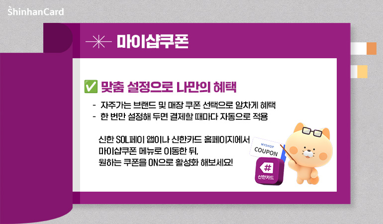 마이샵쿠폰은 신한카드 고객이 자주 가는 매장, 관심 있는 브랜드를 직접 골라 맞춤형 할인·적립 혜택을 받을 수 있는 서비스입니다.