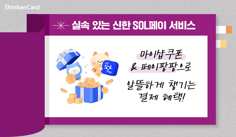 매일 쓰는 결제지만, 그 안에 숨어 있는 혜택까지 잘 챙기고 계신가요? 같은 소비라도 포인트가 쌓이고 할인 쿠폰도 챙겨 결제하는 똑똑한 방법이 있어요. 신한 SOL페이에서는 일상 속 결제에 실속 있는 혜택을 더해주는 다양한 서비스가 준비돼 있는데요. 그중에서도 오늘 소개할 건 바로, ‘마이샵 쿠폰’과 ‘페이팡팡’! 편하게 사용이 가능하지만 놓치기 쉬운 혜택들을 간단히 정리해드릴게요. 스마트한 소비, 지금부터 시작해볼까요?