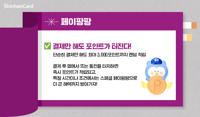 가볍게 한 끼, 소소한 장보기, 온라인 쇼핑 한 번. 일상적인 소비 속에서도 포인트가 '팡팡' 터지는 재미를 느껴본 적 있으신가요? 신한 SOL페이에서 제공되는 ‘페이팡팡’ 이벤트는 단순히 결제만 해도 최대 3,000포인트까지 랜덤 적립되는 특별한 서비스예요. 결제 후 앱의 타임라인에 뜨는 동전을 터치하면 즉시 포인트가 적립되고, 특정 시간이나 조건에서는 스페셜 페이팡팡으로 더 큰 혜택을 받을 수도 있답니다.