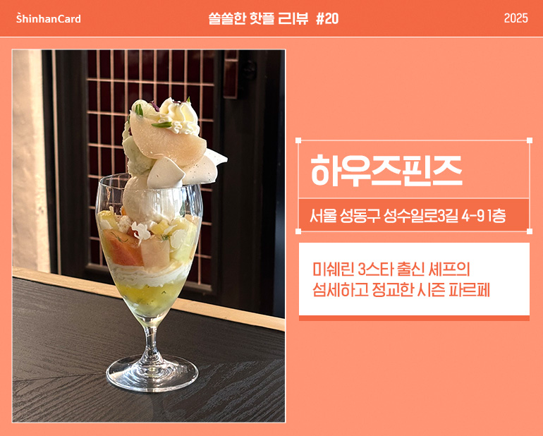 무엇보다 하우스핀즈는 미쉐린 3스타 레스토랑 출신 셰프가 운영하는 곳입니다. 모든 디저트에 꼼꼼한 손길과 깊은 고민이 담겨 있어서, 단순히 달콤한 맛을 즐기는 게 아니라 새로운 경험을 한다는 느낌을 주는데요. 그래서 누구라도 쉽게 접하기 어려운 조합과 감각적인 플레이팅을 만나볼 수 있습니다. 중요한 날 소중한 이들을 대접하는 장소로도 자신 있게 추천입니다! 몇 번을 방문해도 처음처럼 새로운 느낌으로 맞이할 테이블이 벌써 기대되는 곳이에요.