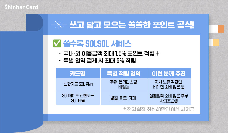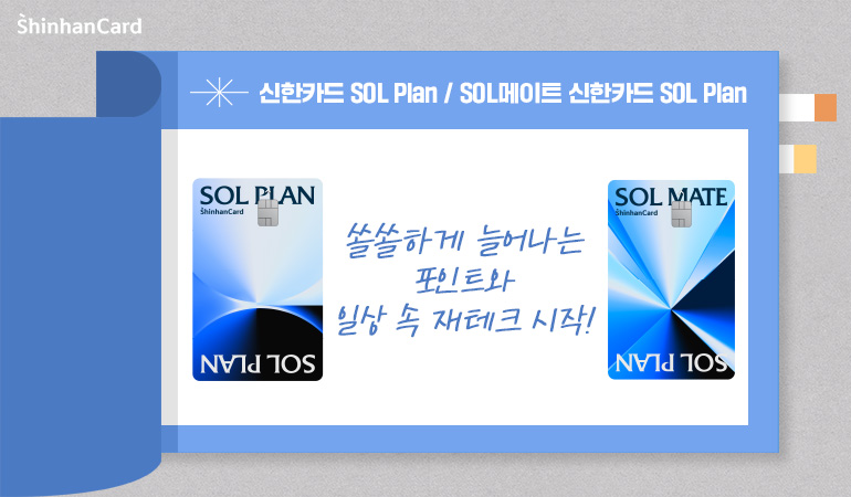 이제는 포인트도 플랜이 필요할 때! 생활 곳곳에서 포인트를 착착 모아주는 두 가지 카드, 신한카드 SOL Plan과 SOL메이트 신한카드 SOL Plan을 소개합니다.