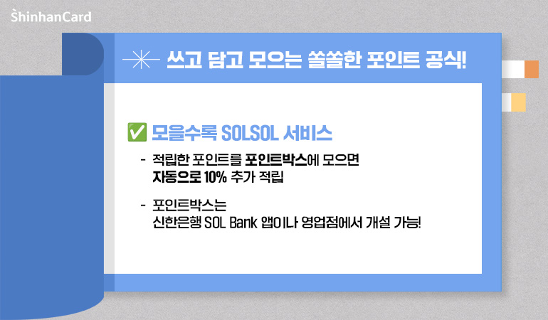 적립된 포인트를 더 가치 있게 활용하고 싶다면 '모을수록 SOLSOL 서비스'가 제격입니다. 이 서비스는 적립된 SOL포인트를 '포인트박스'에 입금하면 해당 금액의 10%를 추가로 적립해주는 구조인데요, 예를 들어 5만 포인트를 모았다면 5천 포인트를 추가로 받게 되는 셈이죠.