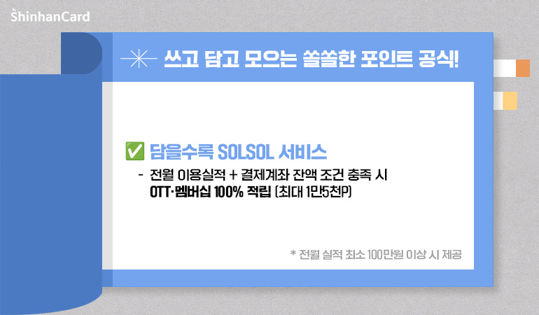 매월 OTT나 멤버십 구독 서비스 비용을 자동납부하고 있다면, 이 서비스는 더욱 주목할 만합니다. 카드 전월 이용금액이 일정 수준 이상이고, 결제계좌(신한은행)의 잔액 조건까지 충족된다면, 넷플릭스, 유튜브 프리미엄, 티빙, 네이버플러스 멤버십, 쿠팡 와우 등의 자동납부 금액 전액에 대해 SOL포인트가 100% 적립됩니다.