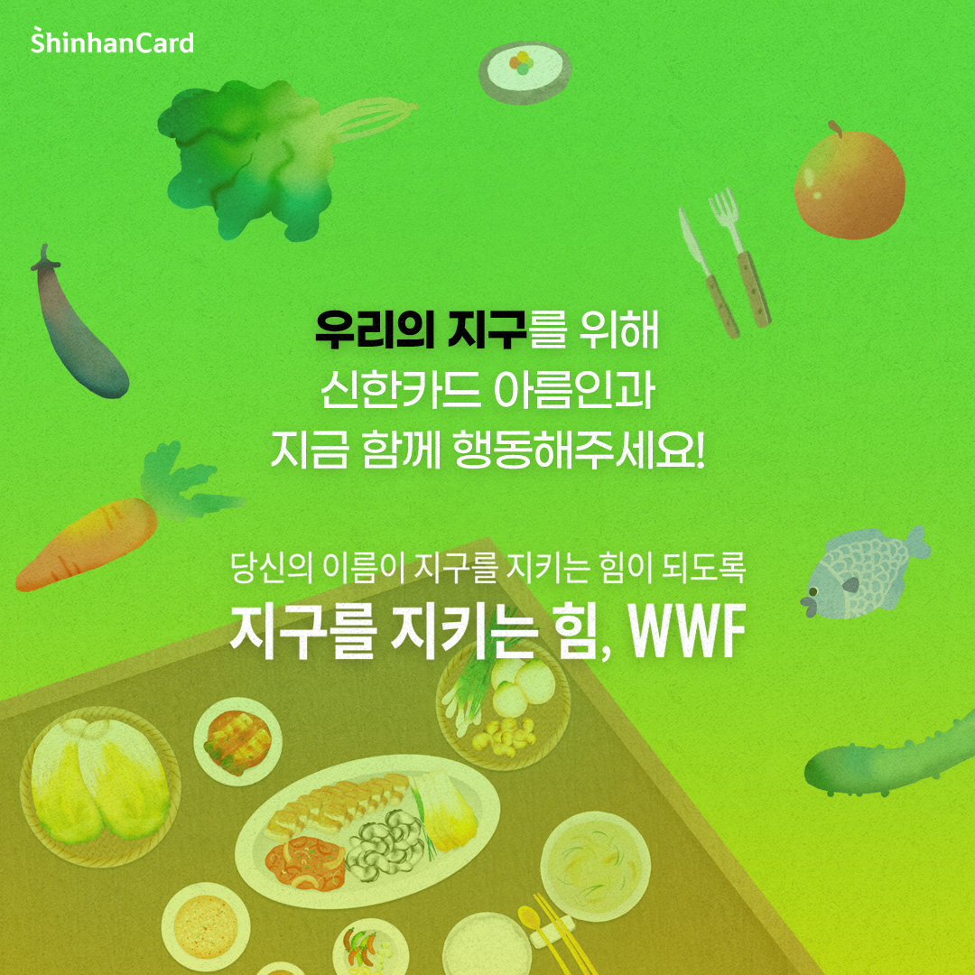 식량 문제는 단순히 음식이 부족해지는 차원이 넘어, 지구의 환경과 우리의 일상에 직접적인 영향을 미치고 있습니다. 기후위기로 인해 농작물이 줄고, 날씨는 더 불안정해지며, 결국 우리가 매일 당연하게 여겨온 식탁까지 위협받고 있습니다. 하지만 변화를 만드는 힘은 여전히 우리의 손에 있습니다. 식탁 위의 작은 선택이 지구의 내일을 바꿀 수 있습니다. 그래서 이번 9월에는 신한카드 아름인이 WWF와 함께 ‘식량 보전 캠페인’을 진행합니다. 오늘의 식탁이, 내일의 지구를 지킬 수 있도록 ‘식량 보전 캠페인’에 여러분도 함께해 주세요! 😊