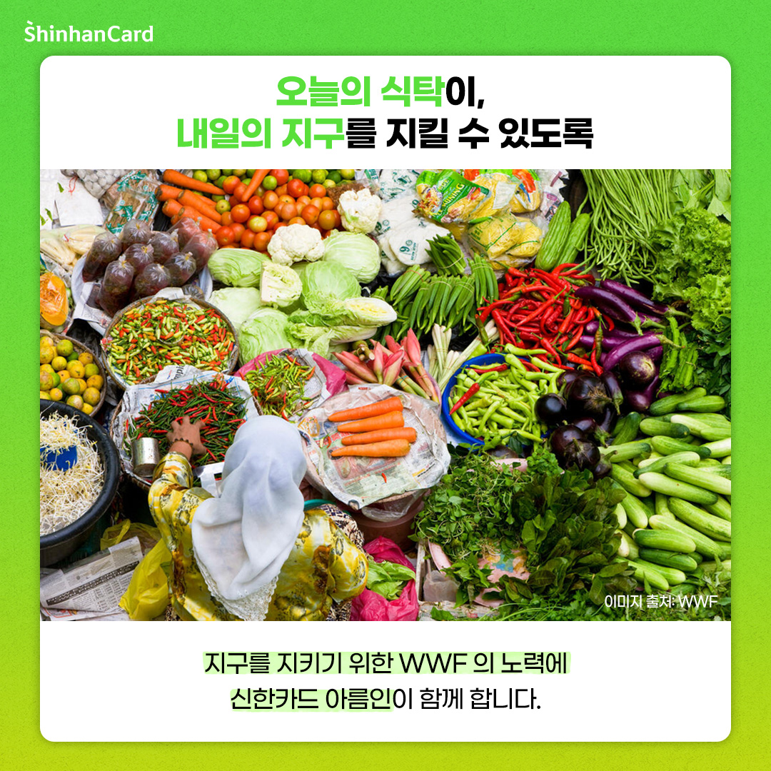 WWF는 지속가능한 식탁을 위해 농지를 넓히는 대신, 기존 토양과 초지를 회복시키고 숲을 복원해, 지속가능한 생산 기반을 마련하고 있습니다. 또한 SBTi(과학 기반 감축 목표)를 통해 농업과 산림 부문에서 감축 로드맵을 제시하고, 이를 기업의 기후 행동 목표에 반영할 수 있도록 지원하고 있을 뿐만 아니라 식품 손실 절감을 위해 글로벌 행동 계획을 수립하고, 공급망 전반의 낭비를 줄이기 위한 노력을 이어가고 있습니다. 이처럼 지구를 지키는 식탁을 만들기 위해 행동하는 WWF의 다양한 활동 지원에 신한카드가 함께합니다. 여러분도 동참해 주세요!