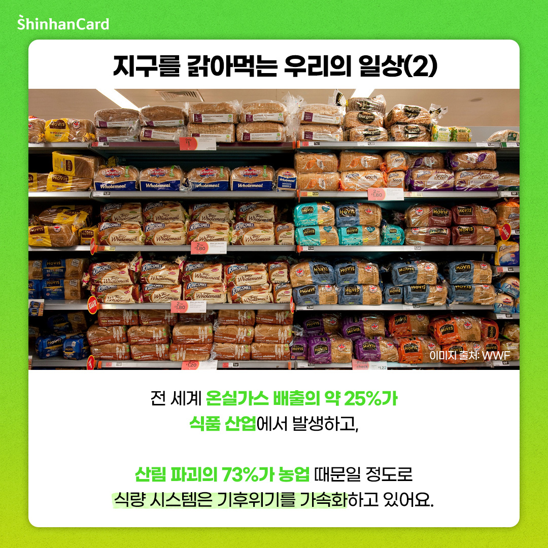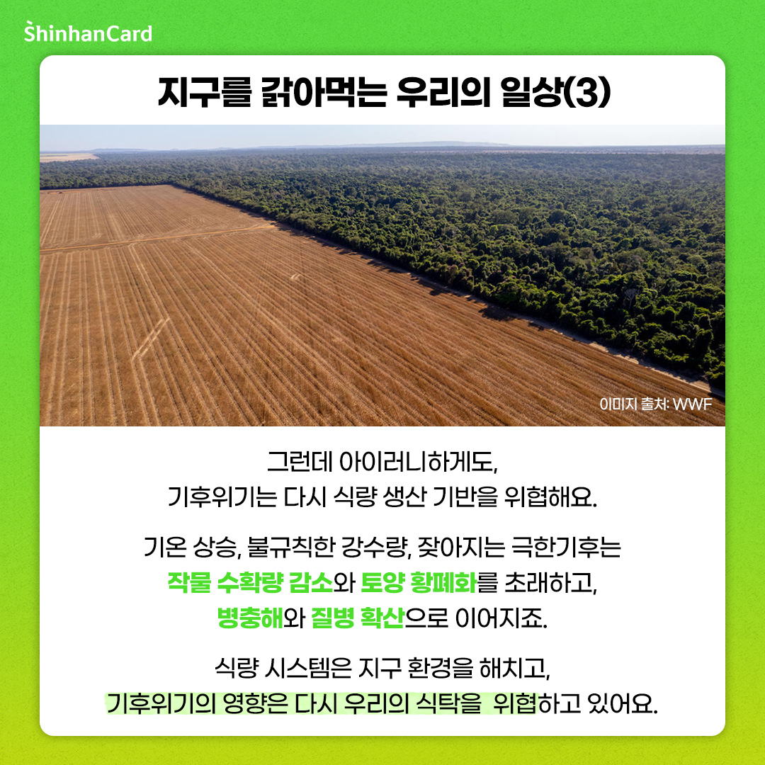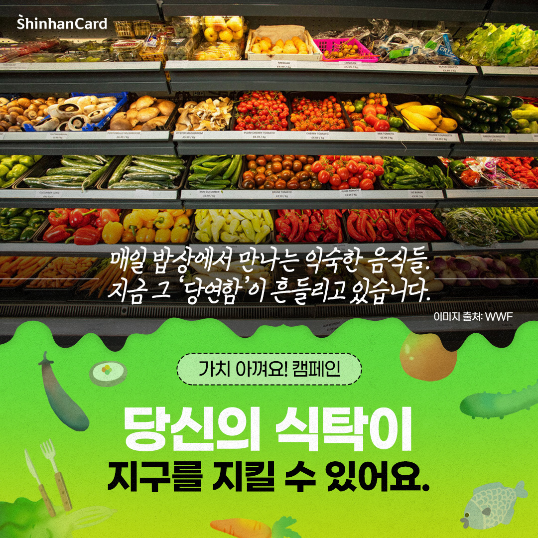 식량 문제는 단순히 음식이 부족해지는 차원이 넘어, 지구의 환경과 우리의 일상에 직접적인 영향을 미치고 있습니다. 기후위기로 인해 농작물이 줄고, 날씨는 더 불안정해지며, 결국 우리가 매일 당연하게 여겨온 식탁까지 위협받고 있습니다. 하지만 변화를 만드는 힘은 여전히 우리의 손에 있습니다. 식탁 위의 작은 선택이 지구의 내일을 바꿀 수 있습니다. 그래서 이번 9월에는 신한카드 아름인이 WWF와 함께 ‘식량 보전 캠페인’을 진행합니다. 오늘의 식탁이, 내일의 지구를 지킬 수 있도록 ‘식량 보전 캠페인’에 여러분도 함께해 주세요! 😊