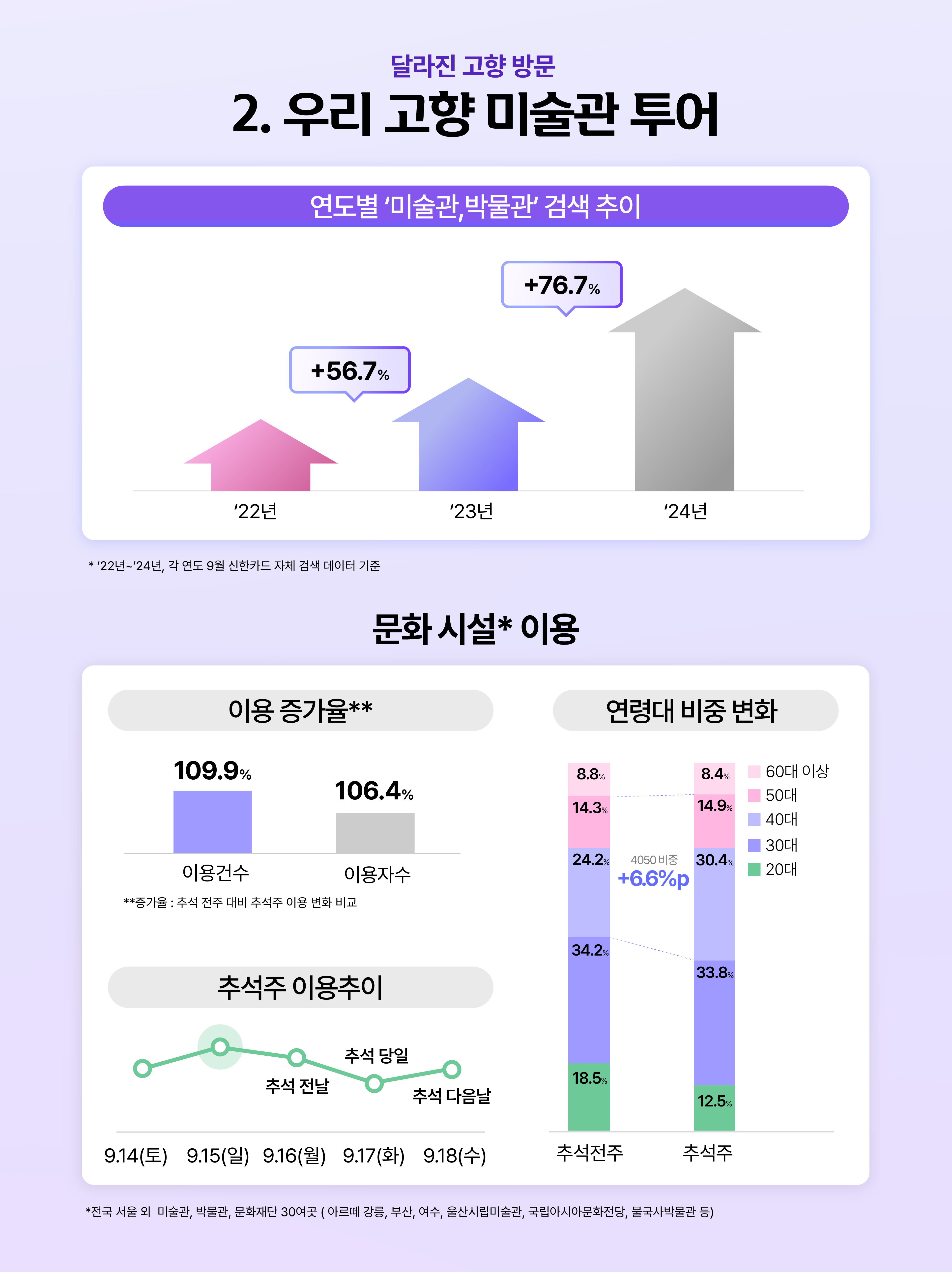 요즘 사람들, 영화관 대신 미술관에 줄 선다는 이야기는 많이 들어보셨죠? 예술에 대한 관심이 늘고 있습니다. 무엇보다 지역 문화시설들이 관람객 친화적인 구성과 전시로 고객들을 사로잡으면서, 미술관과 박물관이 지역 문화의 새로운 중심이 되고 있습니다. 이런 트렌드와 맞물려 추석 연휴 기간 동안 이런 문화시설을 관람하는 사람들도 늘어나고 있는데요. ‘22년부터 ‘24년까지 매년 9월 동안 ‘미술관, 박물관’을 검색하는 ‘검색량’이 늘어나고 있고요. 신한카드 결제 데이터도 같은 흐름을 보여줍니다. 추석 주간 이용건수는 전주 대비 109.9% 증가했고, 특히 40·50 비중이 가장 높았습니다. 추석 연휴 일요일과 추석 다음날에 관람이 집중되며, 지역의 문화시설을 방문하는 새로운 추석이 펼쳐지고 있네요.