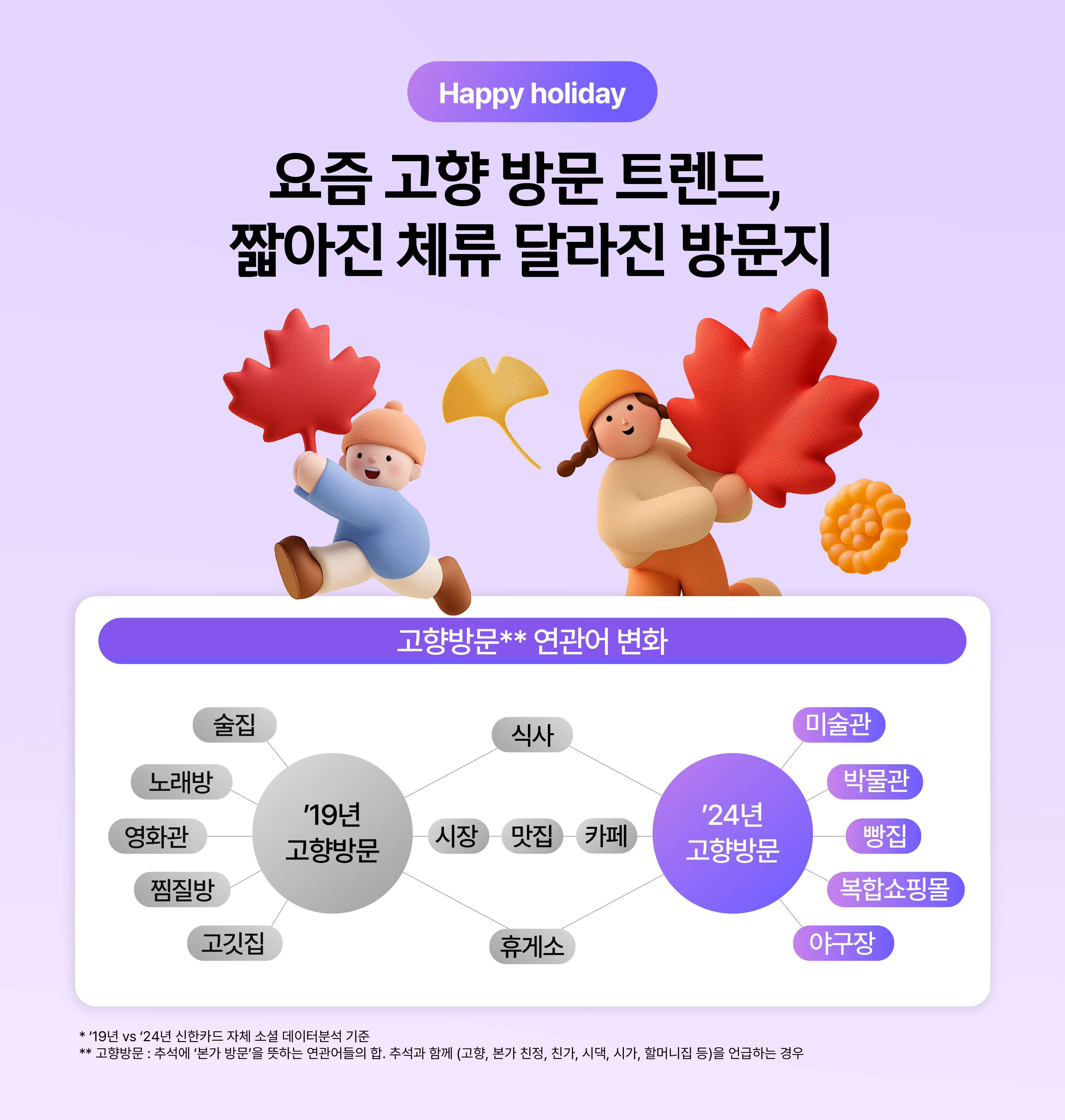 2025년의 추석은 최장 10일, 역대급 황금연휴입니다. 여러분들은 어떤 계획을 세우셨나요? 온 국민이 함께 즐기는 가장 큰 명절, 요즘 추석은 과거와 조금 다른 의미로 다가옵니다. 인구 구조와 가구 구성의 변화, 코로나 이후 비대면 추석의 경험, 달라진 여가 문화와 지역 방문 방식이 추석의 풍경을 새롭게 바꾸고 있기 때문인데요. 신한카드 빅데이터연구소는 이 변화를 데이터로 살펴보면서, 지금 우리의 추석이 어떻게 달라지고 있는지 확인해 보았습니다.