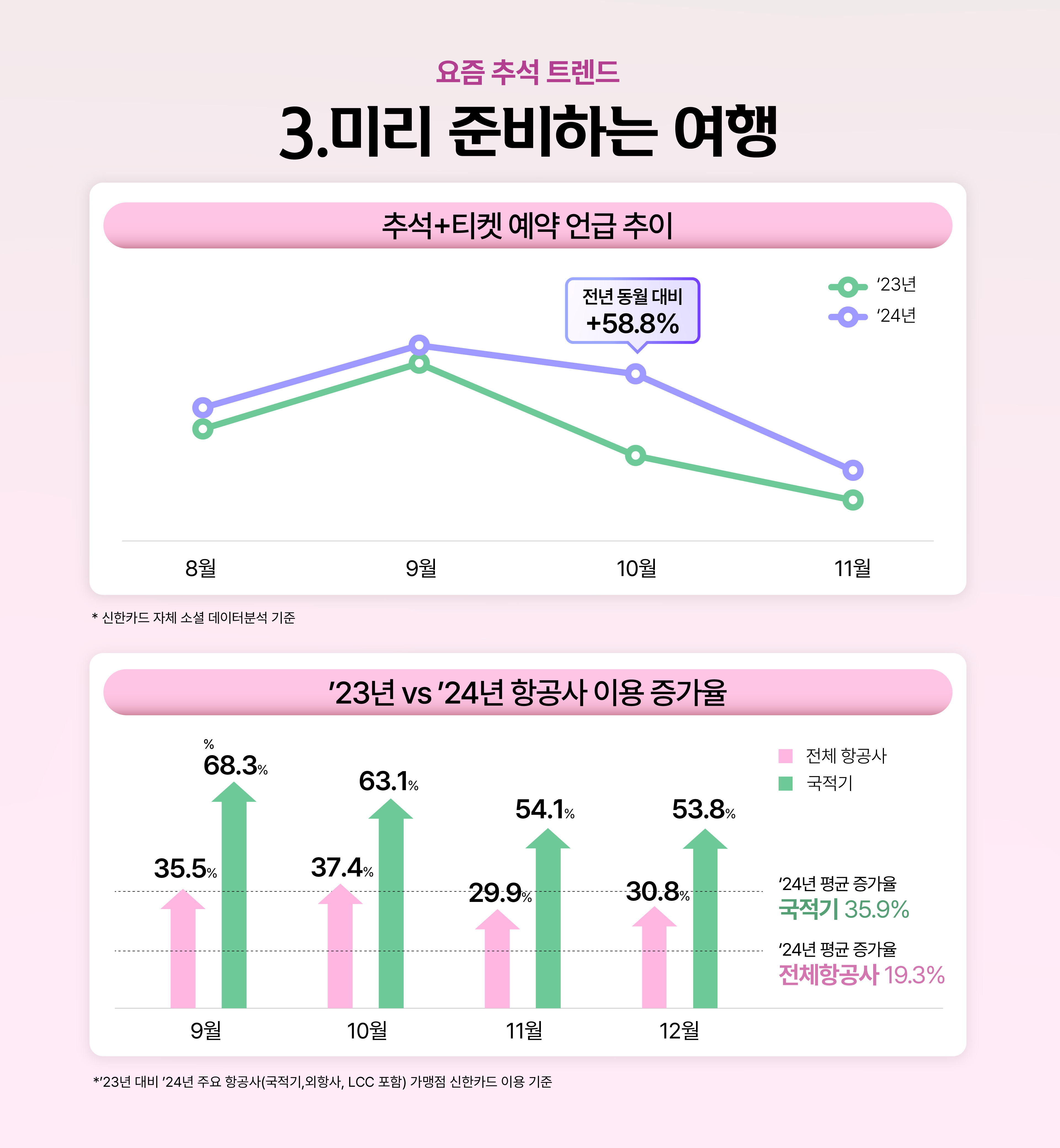 올해처럼 긴 추석 연휴에 여행을 포기하기란 쉽지 않습니다. 그래서인지 저렴하게 항공편을 구매하고자 하는 수요가 전년 대비 높았는데요. 소셜미디어 상에서도 ’24년 10월부터 ’25년 추석 연휴를 대비해 ‘내년 추석 티켓 예약’ 언급량이 전년 동월 대비 58.8% 증가했습니다. 언론에서도 ‘추석 연휴 마일리지 항공권’이 1년 전부터 빠르게 소진됐다는 보도가 이어졌고요. 이 같은 현상은 신한카드 데이터에서도 확인됩니다. ’23년 대비 ’24년, 추석 연휴 직후 9~10월 항공사 결제 건수가 크게 늘었고, 특히 ‘마일리지 항공권’을 1년 전 오픈하는 국적기 항공사의 이용이 더 뚜렷하게 증가했습니다. 저렴한 항공권을 미리 확보하고, 긴 연휴를 기회로 여행을 미리 준비하는 움직임이 뚜렷하게 나타났습니다.