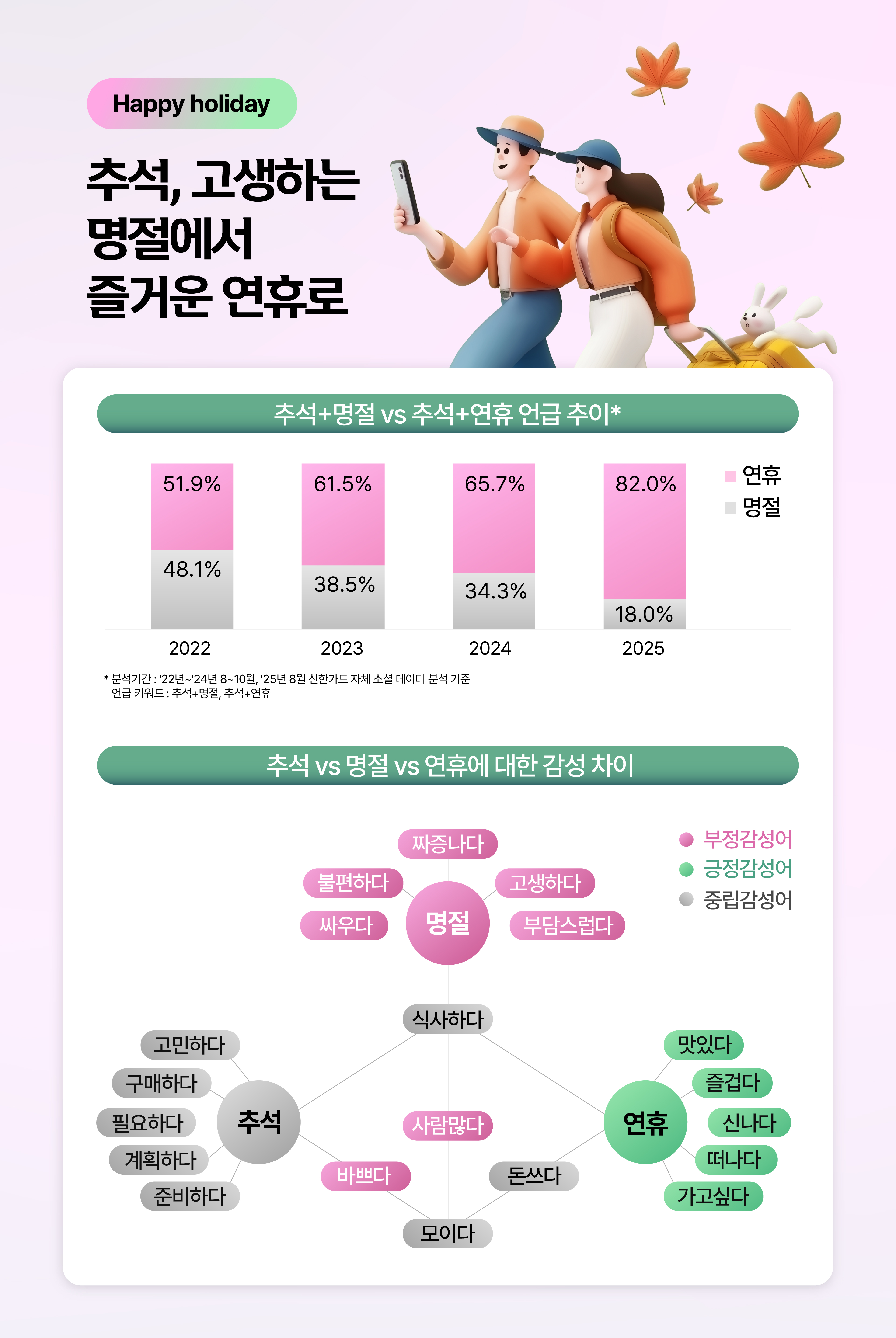 여러분에게 추석은 명절인가요 연휴인가요? 소셜미디어상에서는 추석과 관련해 ‘연휴’ 언급은 늘어나고 ‘명절’ 언급은 줄어들고 있습니다. 그렇다면 명절과 연휴는 어떻게 다를까요? 명절에는 ‘고생하고, 부담스럽고, 짜증난다’와 같은 부정 감성어가, 연휴에는 ‘맛있는 음식, 즐겁고, 신나고, 떠나고, 가고싶다’와 같은 긍정 감성어가 함께합니다. 요즘 추석은, 고생은 덜고 흥은 늘어나는 ‘연휴’로 인식하는 사람들이 더 많아지고 있습니다. 맛과 재미가 더해진 새로운 추석, 사람들은 어떤 방식으로 연휴를 보내고 있을까요?