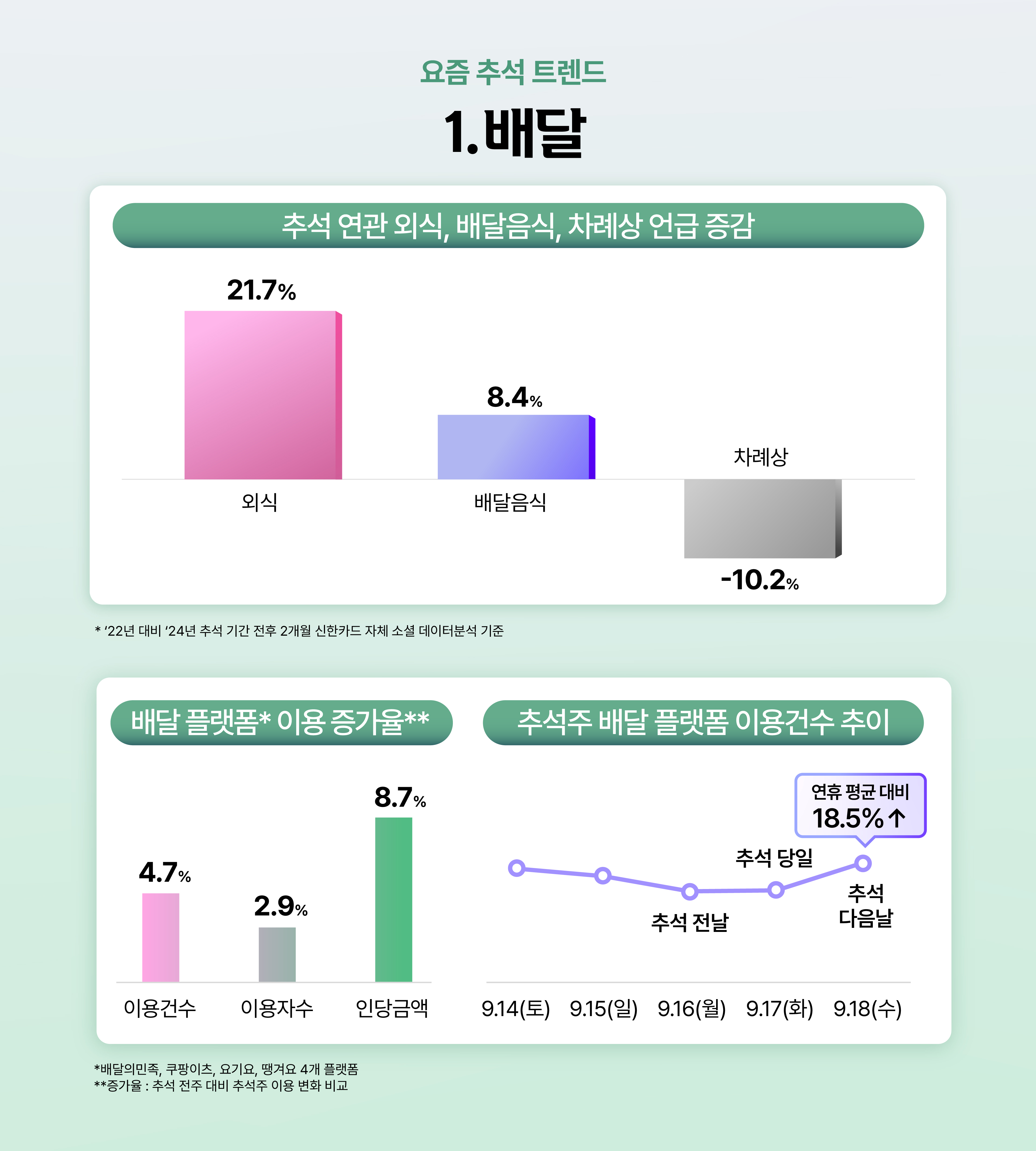 여전히 추석엔 차례를 지내고 성묘를 가지만, 추석 문화는 달라지고 있습니다. 소셜미디어상에서 ‘차례상’에 대한 언급이 ’22년 대비 10.2%나 감소했습니다. 반대로 추석과 함께, 외식, 배달음식을 언급한 경우는 각각 21.7%, 8.4%가 증가했는데요. 신한카드 데이터에서도 같은 흐름이 나타납니다. 추석 연휴 기간 배달앱 이용건수는 전주 대비 4.7% 늘었고, 인당 결제액은 무려 8.7%가 증가했습니다. 특히 추석 다음날은 연휴 평균보다 18.5% 더 많은 고객이 배달 음식을 찾는 것으로 나타났는데요. 추석 다음 날 온 가족이 배달 음식을 즐기는 모습도 새로운 추석 풍경이 되었음을 추측할 수 있습니다.