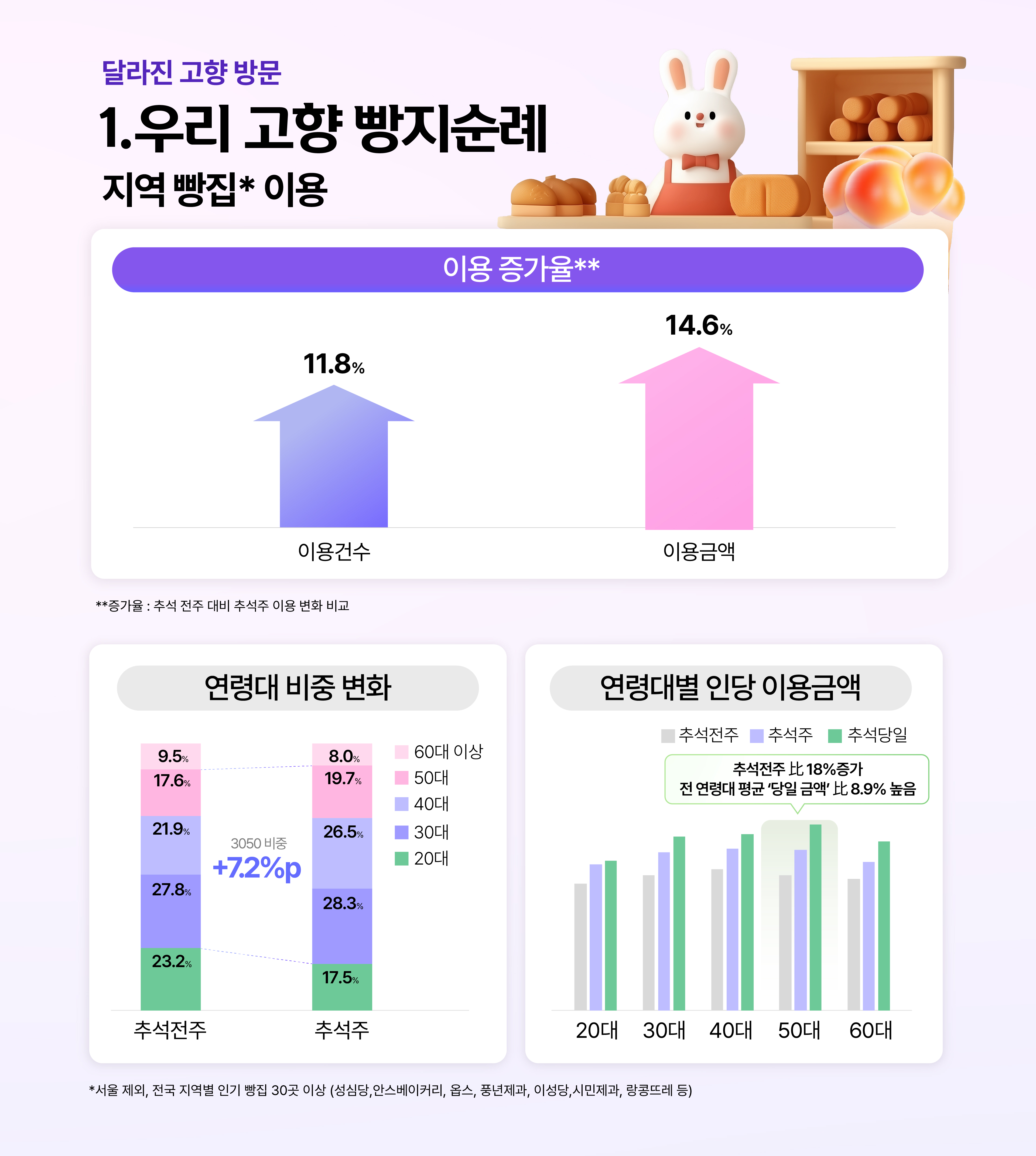 한 글자로 큰 설렘을 주는 단어 ‘빵’. 참으로 사랑스러운 단어인데요. 요즘 ‘빵지 순례’를 전국구로 떠날 만큼 지역 빵집의 위상과 인기가 대단합니다. 대전의 성심당, 군산의 이성당, 광주의 궁전제과, 울산의 랑콩뜨레 … 정말 많은 지역 빵집들이 ‘열일’ 중입니다. 그 빵집이 우리 고향이라면, 안 가볼 수 없겠죠? 그래서인지 추석 주간 빵집 이용건수와 금액이 모두 전주 대비 증가했습니다. 온 가족이 모여 먹는 만큼 빵집 이용금액의 증가도 큰데요. 평소에는 20·30세대 중심이던 이용이, 추석에는 40대 이상으로 확산된 점이 특징입니다. 기존에 인당 이용금액이 가장 높은 연령대는 40대이나, 추석 당일만큼은 50대의 인당 이용금액이 가장 높게 나타났습니다. 가족이 함께 모여 고향의 빵집을 찾고, 빵을 사서 나눠 먹는 모습이 새로운 명절 문화로 자리잡고 있습니다.