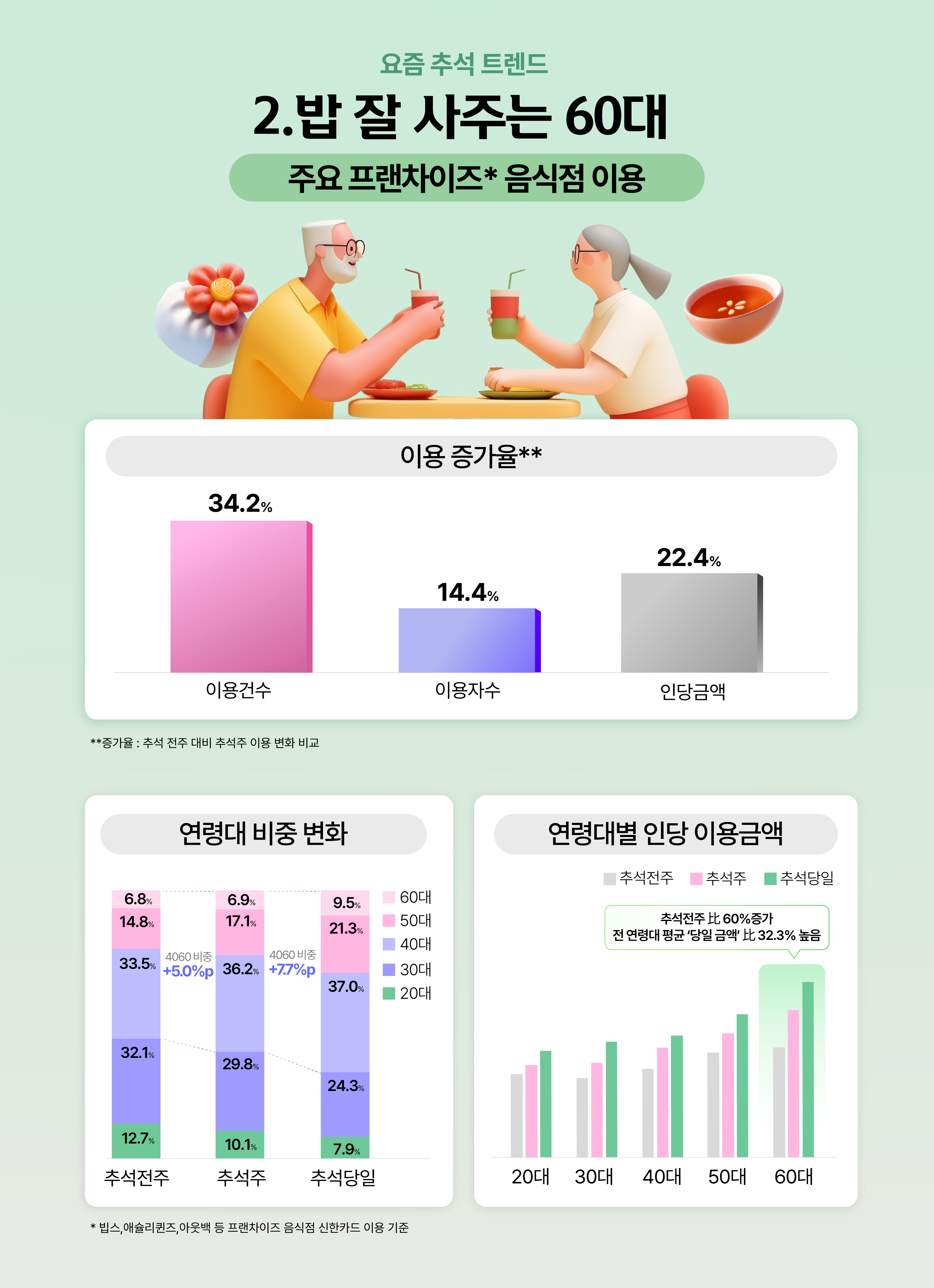 ‘24년 추석 외식 이용은 어땠을까요? 지난해 추석, 고물가와 불경기 여파로 빕스, 애슐리퀸즈, 아웃백 등 가족친화적 외식 프랜차이즈가 추석 특수를 누렸다는 보도가 많았습니다. 실제 신한카드 고객들의 결제를 통해서도 추석 전주 대비 추석주 동안 해당 프랜차이즈 음식점의 이용건수와 이용자수가 모두 증가했음을 확인할 수 있었는데요. 흥미로운 점은 추석주 동안 이용자 연령대입니다. 연령대별로 보면 40대가 가장 많이 이용했지만, 추석주 동안 4060대의 비중이 눈에 띄게 증가했습니다. 특히 추석 당일, 60대의 인당 이용금액이 가장 높았는데요. 명절날 손맛 대신, 가족을 위해 외식을 선택하는 새로운 모습을 ‘요즘 조부모님’들이 보여주고 있는 거 아닐까요?