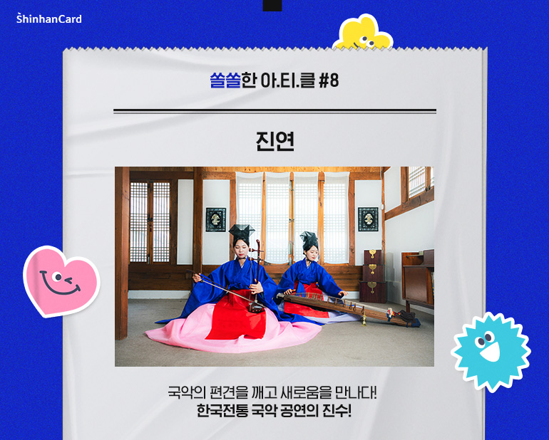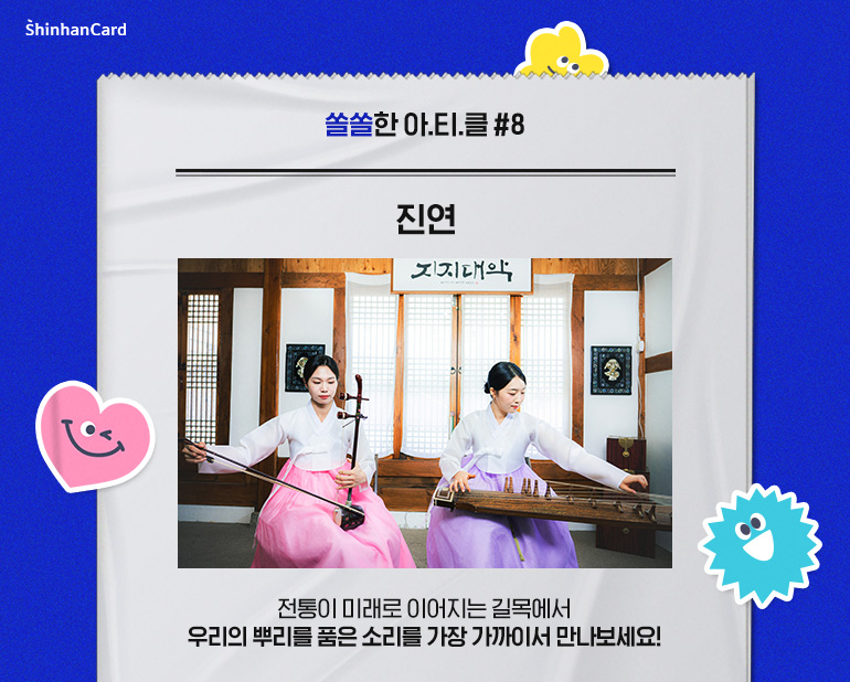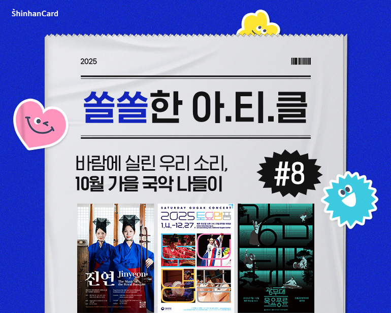 한국인의 정체성과 자부심이 담긴 소리, 국악! 이번 가을에는 숨겨진 국악의 매력을 새롭게 발견하며 우리 문화의 깊이를 직접 느껴보세요. 익숙하면서도 낯선 듯 다가오는 선율 속에서 우리는 그 안에 담긴 이야기를 더 많이, 더 가까이 알고 싶어질 것입니다. 우리 마음속에 오래도록 머물며 특별한 계절의 추억으로 남게 될 가을의 국악나들이. 신한카드와 함께 떠나보는 건 어떨까요?