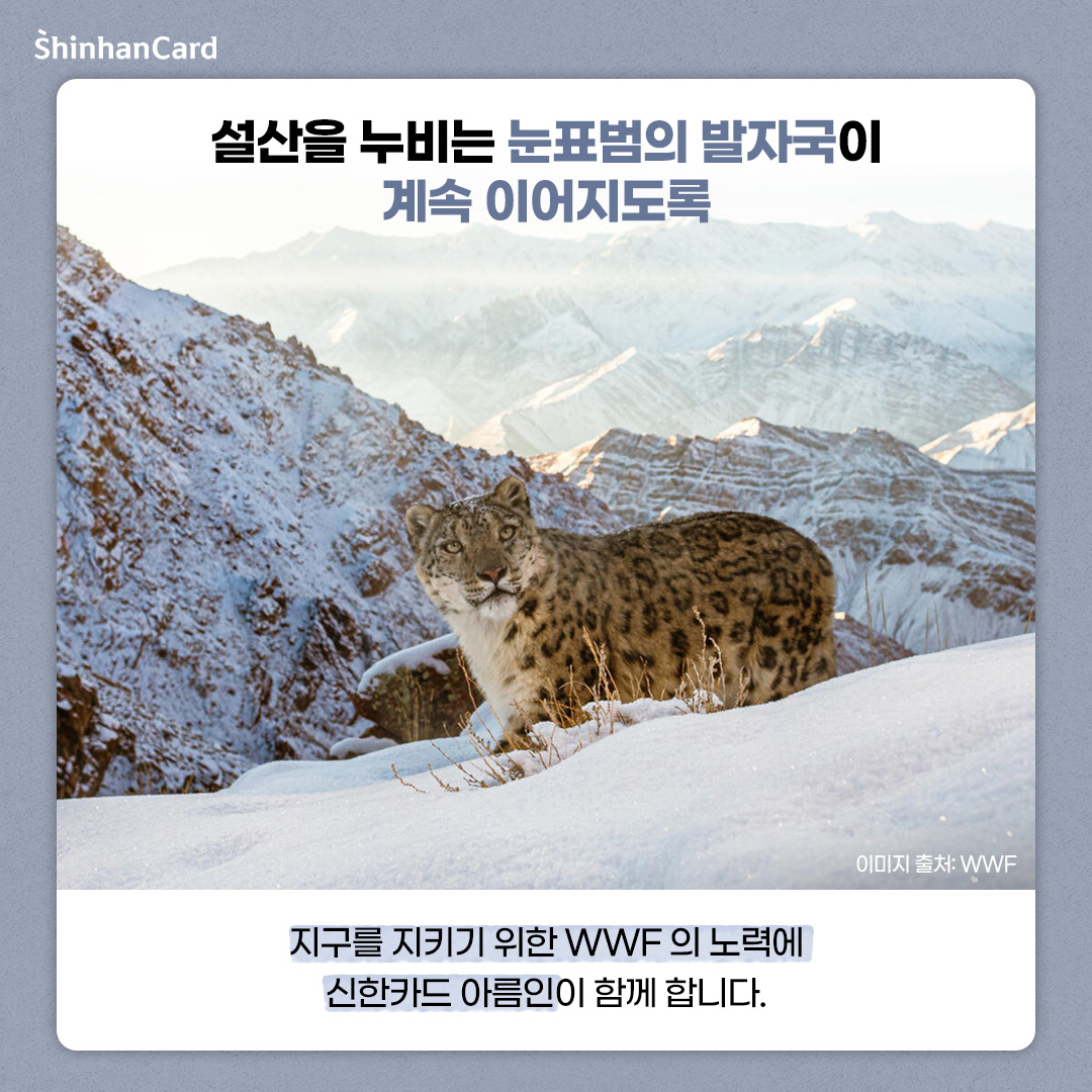 눈표범은 설산의 생명 순환을 지탱하는 존재입니다. 그들이 사라진다면, 산의 생명도 함께 무너집니다. 설산이 녹아내리고, 그 위의 생명들이 사라지는 지금, 우리는 눈표범을 지켜야 합니다. 다가오는 10월 23일 ‘세계 눈표범의 날’을 맞이하여 이번 10월에는 신한카드 아름인이 WWF와 함께 ‘눈표범 보전 캠페인’을 진행합니다. 눈표범의 발자국이 계속 이어질 수 있도록 ‘눈표범 보전 캠페인’에 여러분도 함께해 주세요! 😊