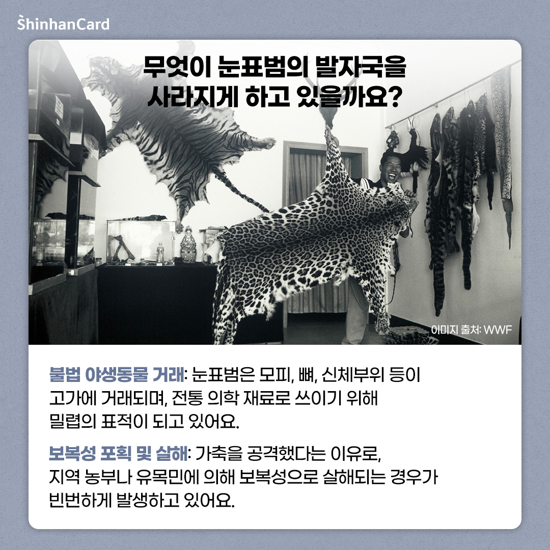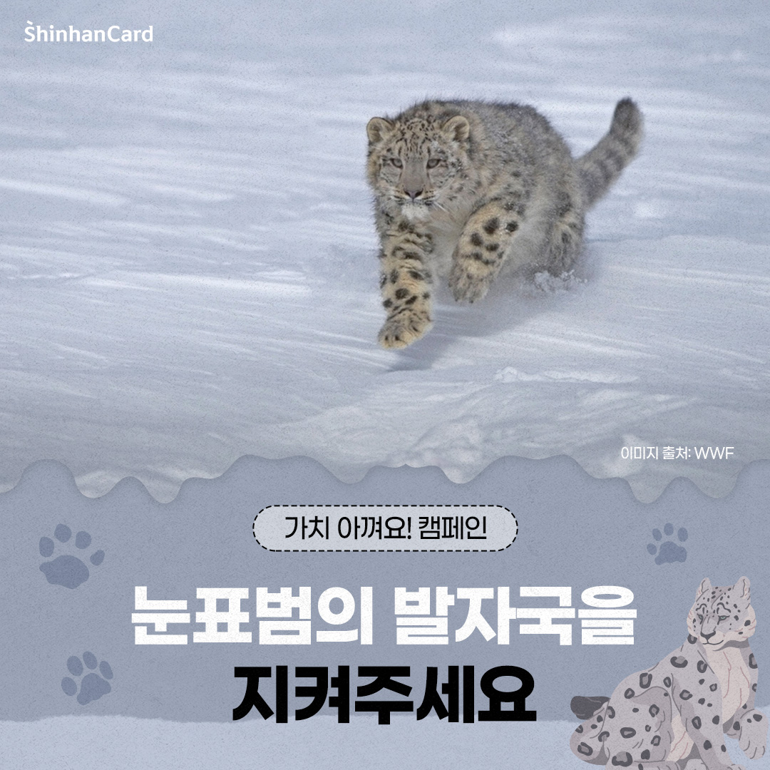 눈표범은 설산의 생명 순환을 지탱하는 존재입니다. 그들이 사라진다면, 산의 생명도 함께 무너집니다. 설산이 녹아내리고, 그 위의 생명들이 사라지는 지금, 우리는 눈표범을 지켜야 합니다. 다가오는 10월 23일 ‘세계 눈표범의 날’을 맞이하여 이번 10월에는 신한카드 아름인이 WWF와 함께 ‘눈표범 보전 캠페인’을 진행합니다. 눈표범의 발자국이 계속 이어질 수 있도록 ‘눈표범 보전 캠페인’에 여러분도 함께해 주세요! 😊