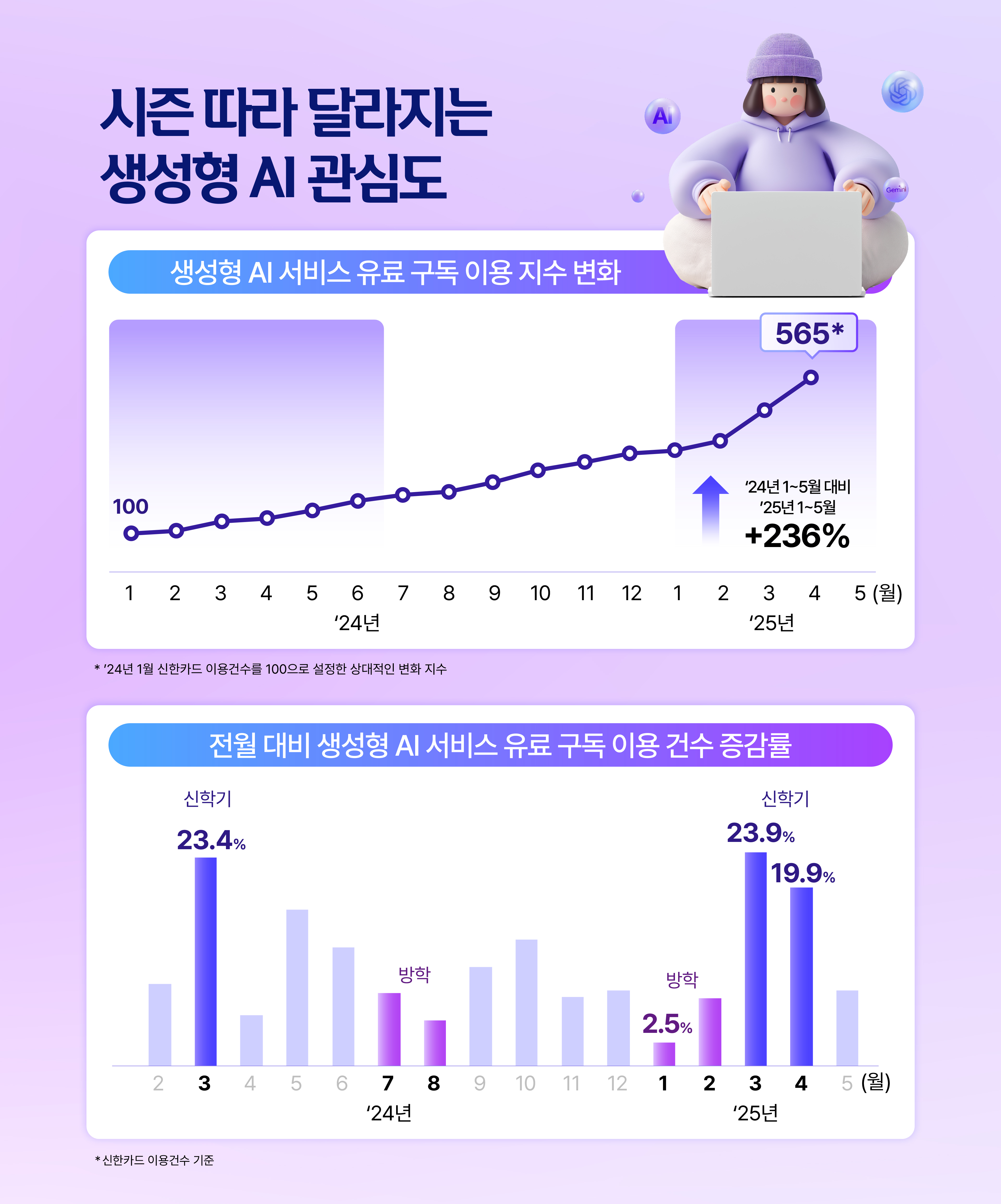 요즘 다들 하나쯤은 구독하고 있는 새로운 일상 필수템, 바로 생성형 AI죠. 과제와 업무는 물론, 일상의 대화까지 이제 AI 없는 삶은 상상하기 힘들어졌습니다. 챗GPT 유료 구독이 시작된 지 벌써 3년, 신한카드 빅데이터연구소가 생성형 AI의 정기 구독 트렌드를 살펴보았습니다.