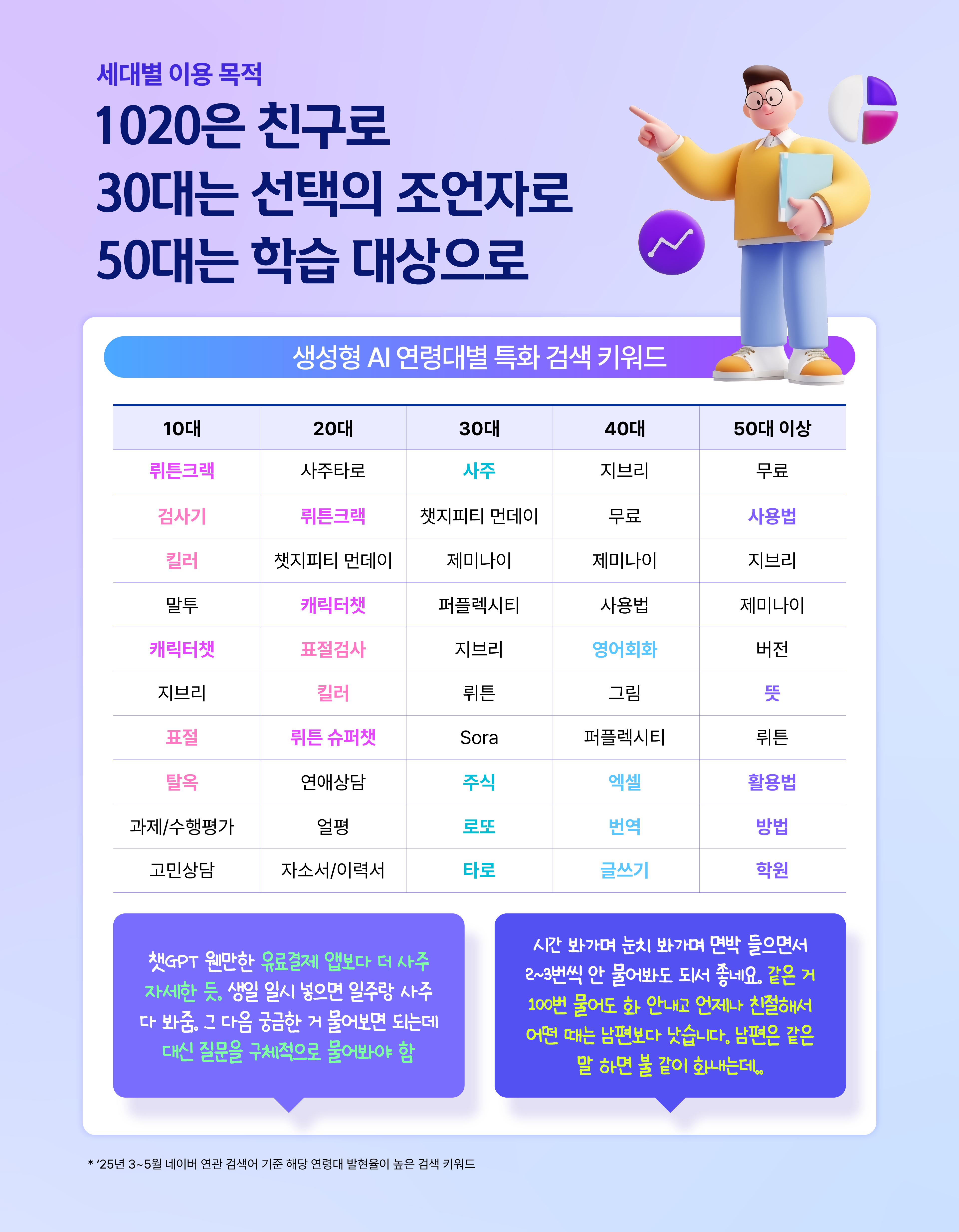 이번에는 연령대별 포털 검색 데이터를 통해, 사람들이 AI를 일상에서 어떤 목적으로 활용하는지 살펴봤습니다. 10대는 과제, 수행평가, 고민상담, AI채팅처럼 학업과 일상의 고민을 해결하는데 AI를 찾는 경우가 많았고, 20대는 자소서, 논문, 과제 등 학업 중심의 검색 비중이 두드러졌습니다. 특히 1020세대 모두 과제에 AI를 활용하는 빈도가 늘면서, ‘GPT 킬러’ 처럼 AI 티 나지 않게 검사해주는 툴까지 주목 받고 있었죠.
