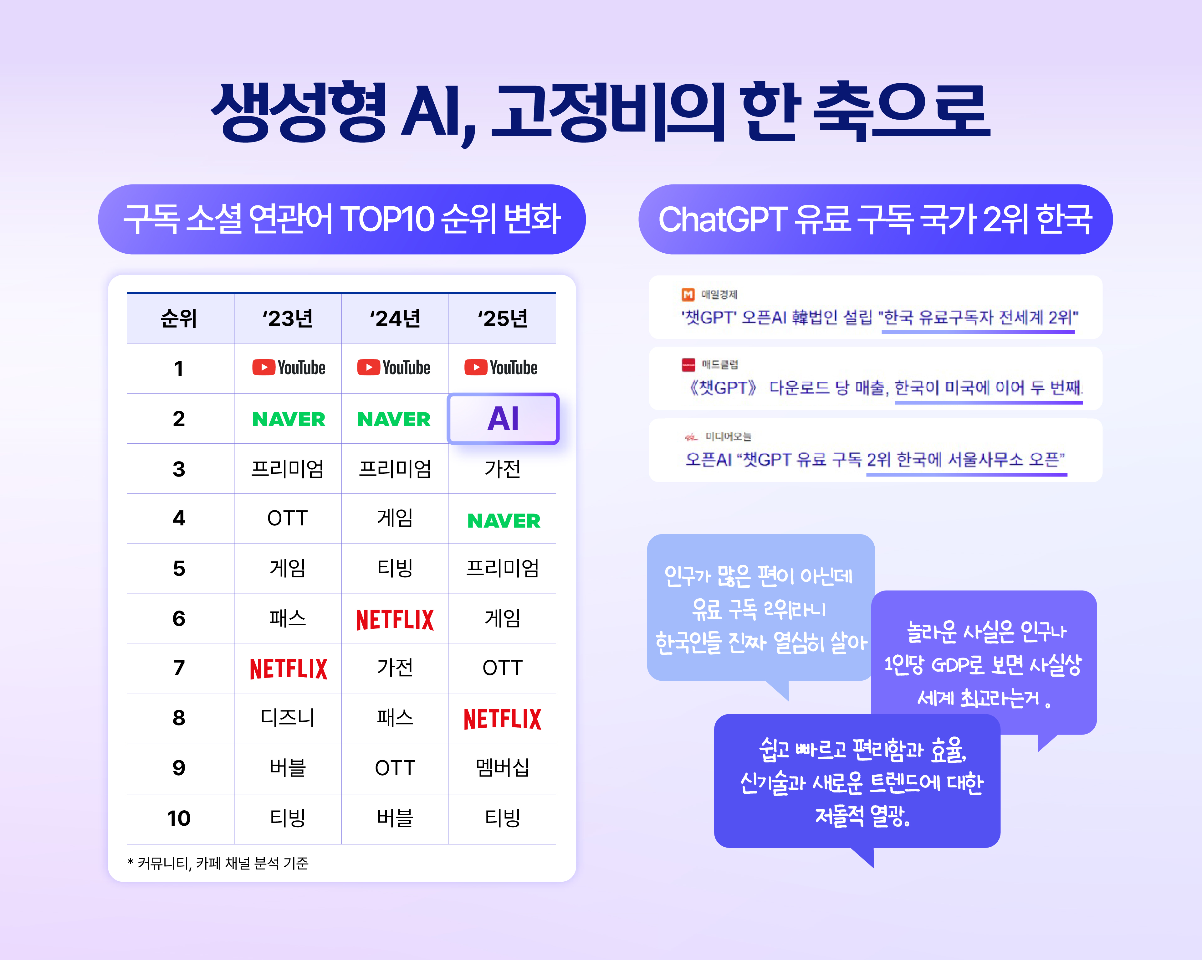 ’23~’24년까지만 해도 SNS상에서 구독 대상으로 크게 주목받지 못했던 AI. 하지만 올해 들어서는 유튜브, 네이버와 나란히 상위권에 오르며 주요 구독 아이템으로 떠올랐습니다. 지난 5월 OpenAI는 한국이 미국에 이어 챗 GPT 유료 구독자 수 2위를 기록중이라고 밝혔는데요. 인구 대비로 보면 사실상 전 세계 1위 수준이죠. 신기술과 트렌드를 자연스럽게 받아들이고 과감히 투자하는 모습은 한국 소비자들만의 특징이라고 볼 수 있습니다.