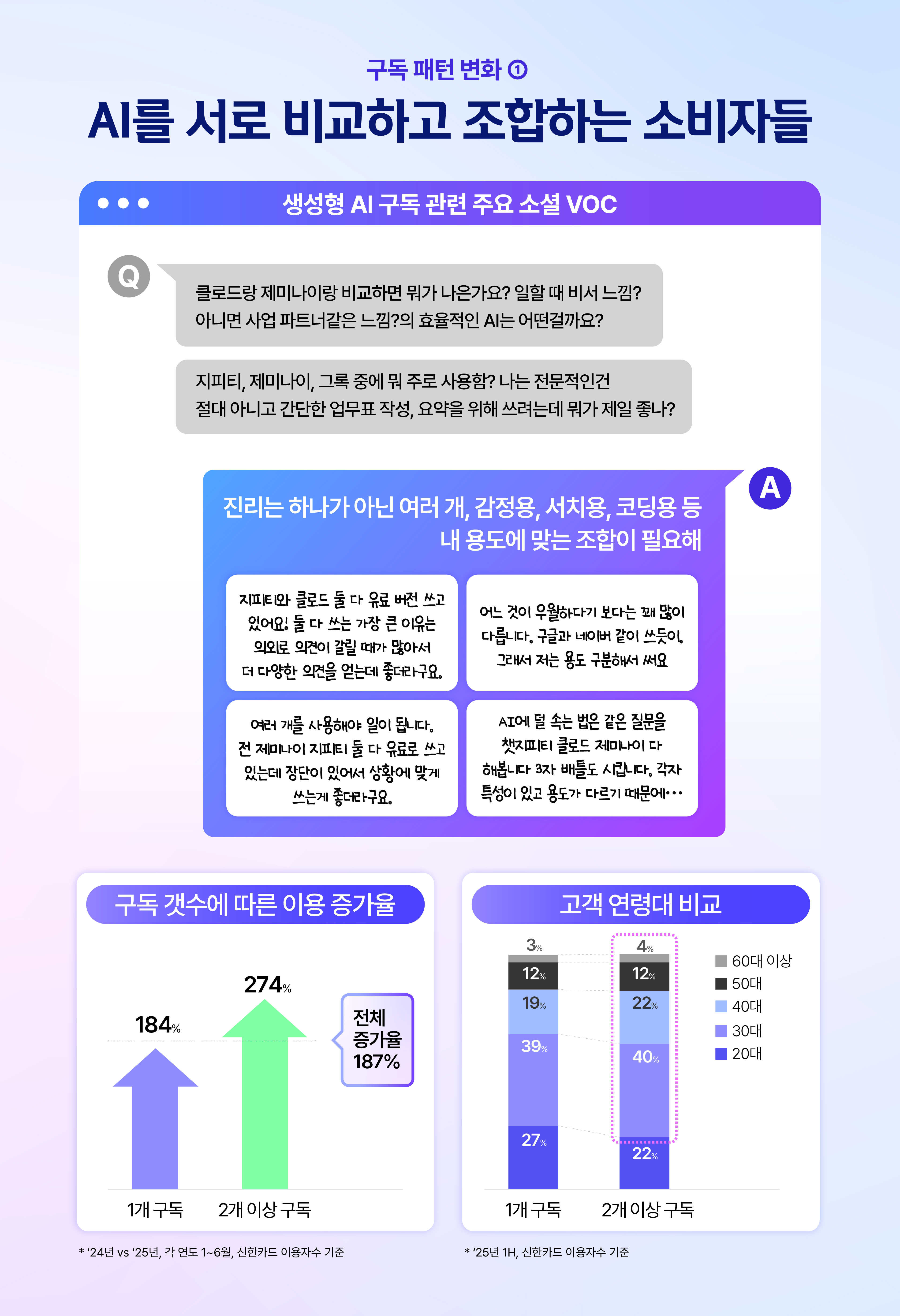 신한카드 고객의 구독 데이터를 통해서도 이런 흐름이 확인됩니다. 하나의 AI만 구독하는 구독자보다, 두 개 이상 구독자가 전년 대비 크게 늘어난 것이죠. 특히 2개 이상 복수 구독자는 30~40대 비중이 높게 나타나는데요. 20대 대비 구독료의 부담을 적게 느끼며, 자신에게 맞는 서비스를 적극적으로 탐색한다고 볼 수 있습니다.