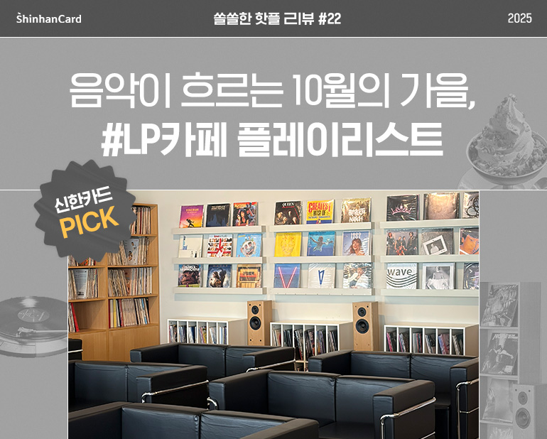 LP가 MZ세대의 소장품이 되고, LP바가 인기 데이트 코스로 자리매김하는 것을 보면 이제 특정 세대의 전유물로 기억되는 것은 점점 더 사라지는 것 같기도 합니다. 그 경계 없음이 우리의 일상을 좀 더 풍요롭고 아름답게 만들어 주리라 믿어요. 그리고 그렇게 취향을 느긋이 음미하는 마음이, 유난히 깊어지는 가을의 공기와도 잘 어울리지 않나요? 신한카드가 소개하는 가을 핫플, 분위기 있는 LP카페에서 음악과 함께 잊을 수 없는 시간을 보내시길 바랍니다.