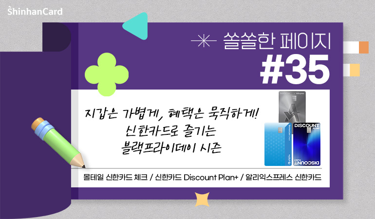 매년 11월이면 다양한 쇼핑 플랫폼에서 파격적인 세일 행사를 진행하고는 합니다. 장바구니에 담아두었거나 눈여겨보고 있던 제품이 있다면 특템할 기회! 국내 쇼핑을 계획하고 있는 분들께는 신한카드 디스카운트플랜+를 추천합니다. 이 카드는 할인을 위한 다양한 플랜 혜택을 제공하는데요. 할인시기에 할인을 더할 수 있으니 블랙프라이데이처럼 쇼핑이 몰리는 때에 매우 유용합니다.