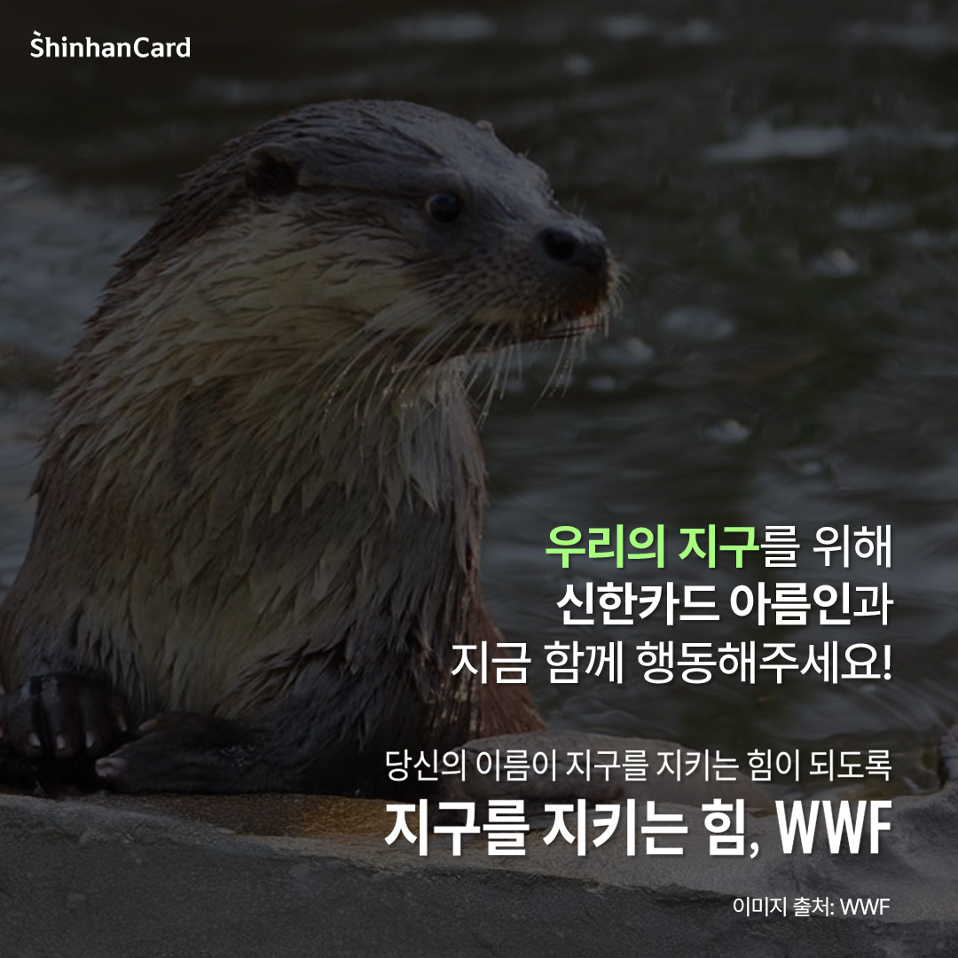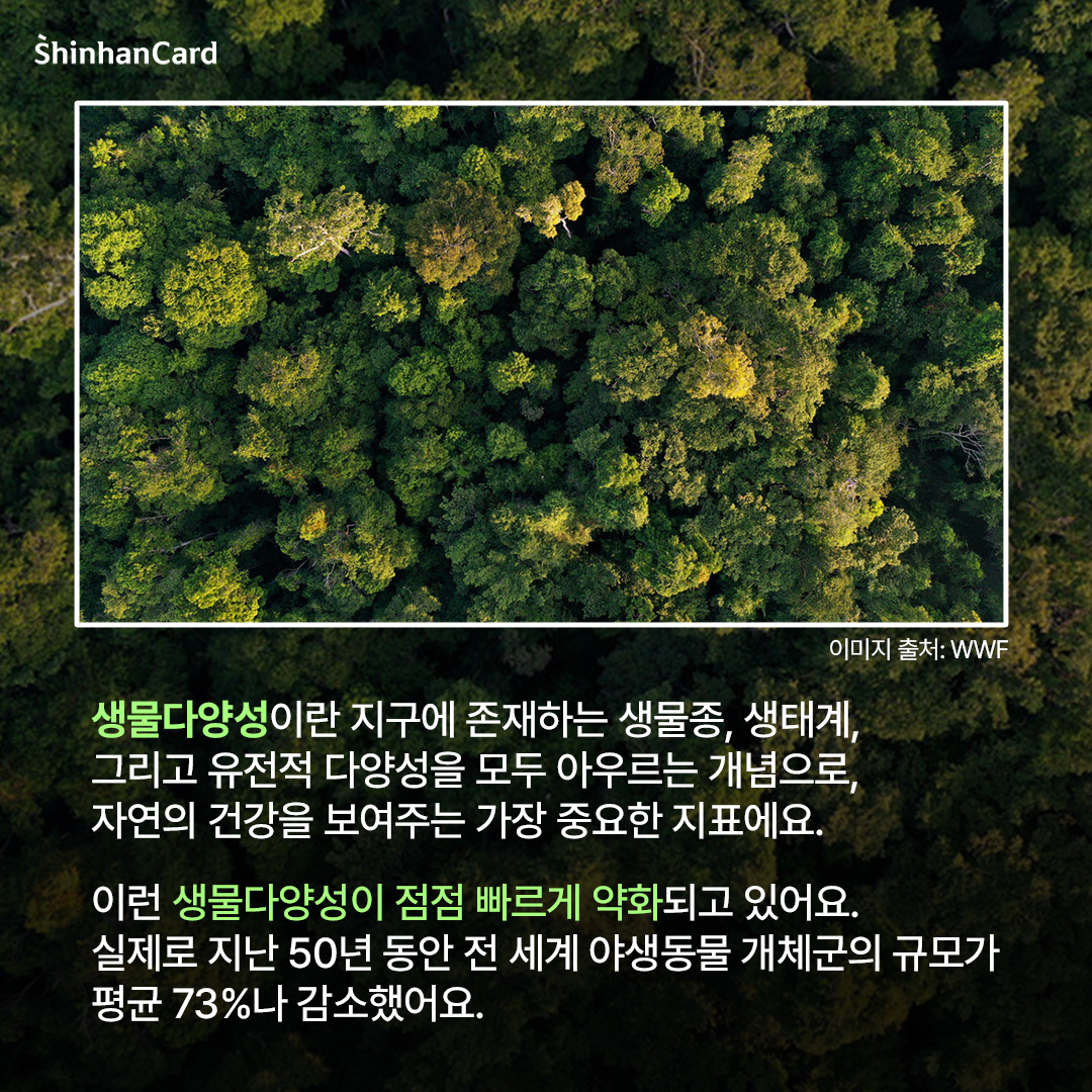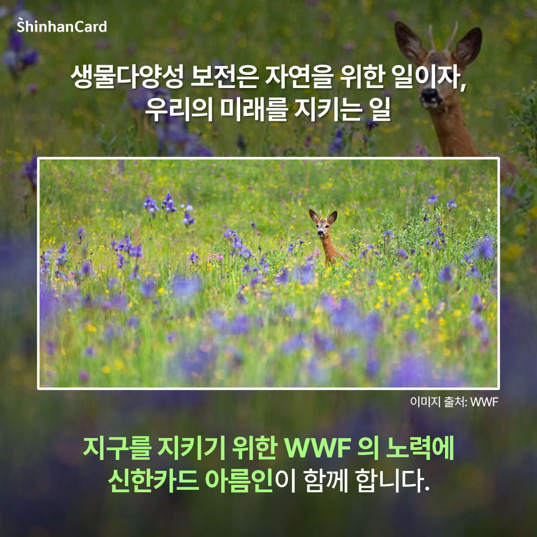 생물다양성 보전은 단순히 자연을 보호하는 선의의 행동이 아닙니다. 이는 인간이 앞으로도 지속 가능한 환경 속에서 살아가기 위한 필수적인 조건입니다. 생태계가 건강해야 자연은 스스로 회복할 수 있고, 그 안에서 인간의 삶 역시 안정적으로 유지될 수 있습니다. 이번 1월에는 신한카드 아름인이 WWF와 함께 ‘생물다양성 캠페인’을 진행합니다. 지구의 다양한 생명이 앞으로도 함께 살아갈 수 있도록, ‘생물다양성 캠페인’에 여러분도 함께해 주세요! 😊