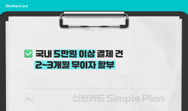 신한카드 Simple Plan은 국내 가맹점에서 5만원 이상 결제 시 2~3개월 무이자할부를 제공합니다.