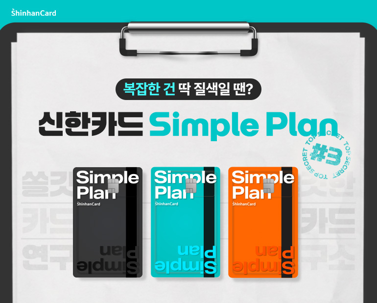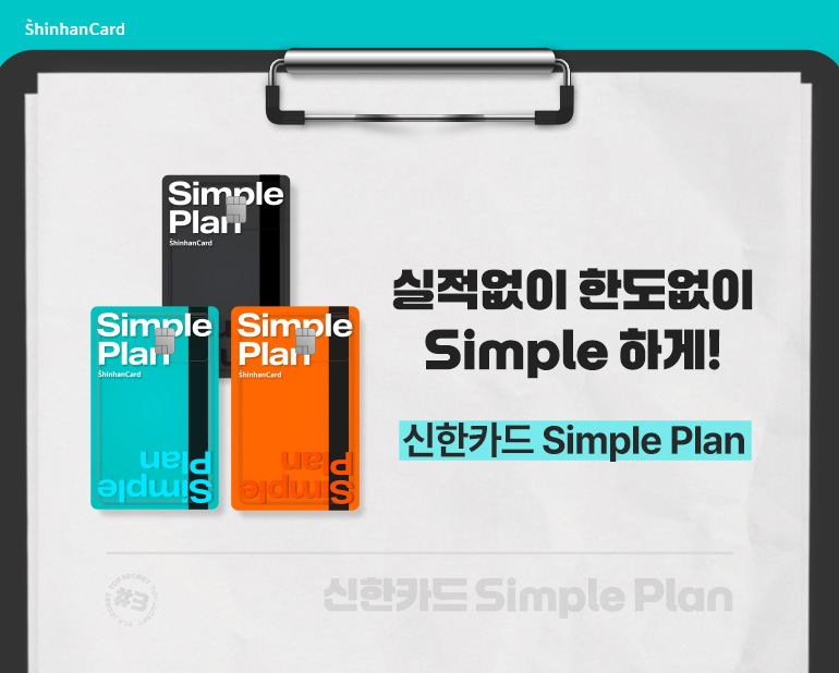 그래서 준비했습니다. 이름처럼 심플한 선택, 신한카드 Simple Plan! 실적 조건 없이, 할인 한도 걱정 없이. 말 그대로 복잡함을 덜어낸 심플한 카드입니다.