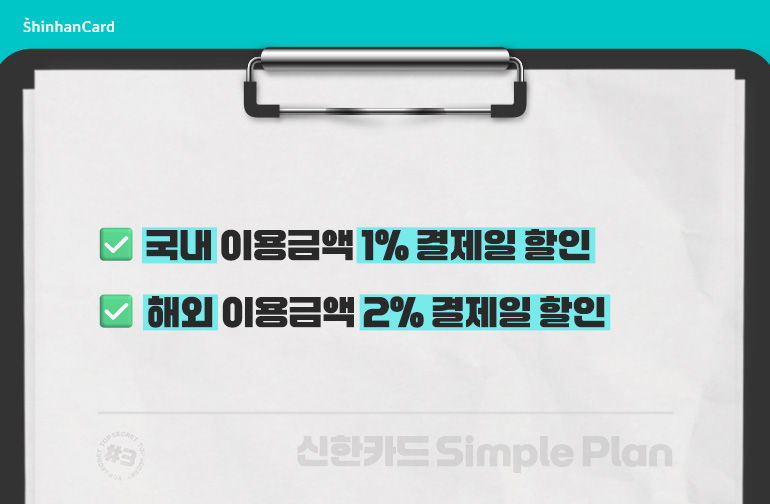 혜택은 단순하지만 확실합니다. 국내 이용금액의 1%, 해외 이용금액의 2%를 결제일에 할인해드립니다. 전월 실적 조건도 없고, 할인 한도도 없습니다. 얼마를 써야 받을 수 있는지 계산할 필요 없이, 사용한 만큼 자연스럽게 할인 받을 수 있죠.