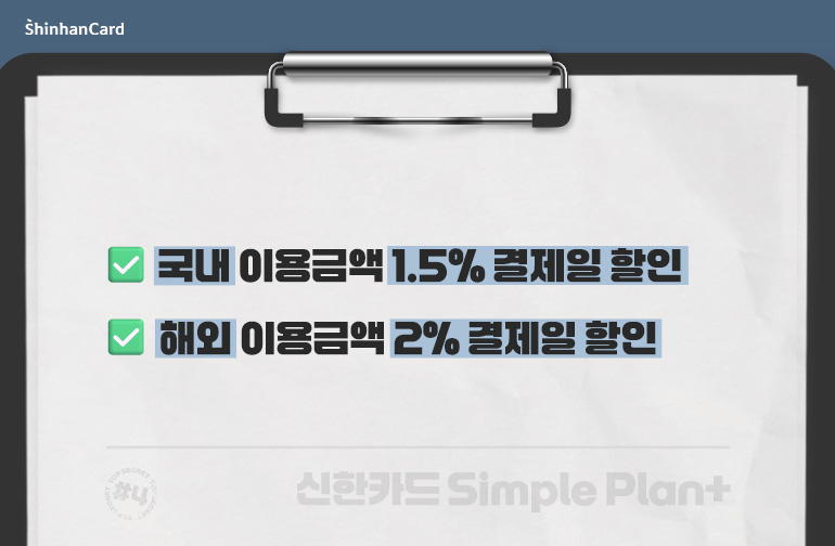 신한카드 Simple Plan+의 핵심은 여전히 단순하고 명확합니다. 전월 실적 없이, 한도 제한 없이 사용한 만큼 할인 받을 수 있죠. 국내 이용금액의 1.5%, 해외 이용금액의 2%가 결제일에 할인됩니다. 특정 업종에 제한된 혜택이 아니라 대부분의 가맹점에서 적용되기 때문에 일상에서 Simple하게 바로 혜택을 누릴 수 있어 편리하죠.