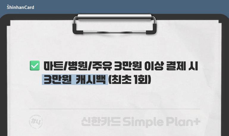 신한카드 Simple Plan+의 차별화 포인트는 ‘웰컴 캐시백’ 서비스입니다. 카드를 처음 사용하는 고객이라면 마트, 병원, 주유 업종에서 3만원 이상 결제 시 3만원 캐시백 혜택이 제공됩니다. 복잡하게 챙길 필요 없이 카드 사용과 함께 바로 적용되는 웰컴 캐시백을 받아 보세요