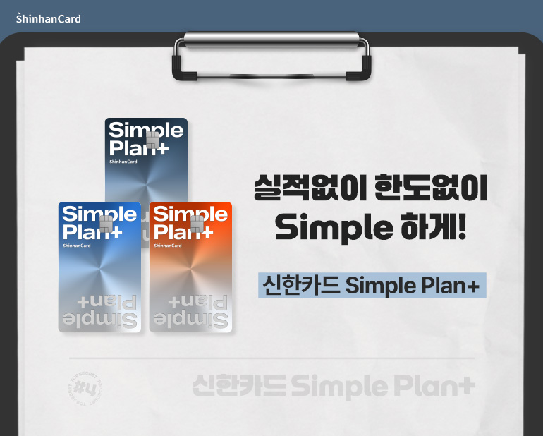 좋은 카드는 복잡하지 않습니다. 언제 어디서든 고민 없이 선택할 수 있어야 하니까요. 신한카드 Simple Plan+는 전월 실적이나 한도에 대한 부담 없이, 일상 속에서 Simple하게 사용할 수 있는 카드입니다.