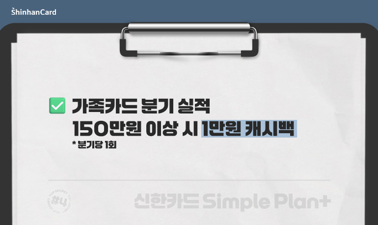 가족과 함께 카드를 사용하는 고객을 위한 혜택도 제공합니다. 신한카드 Simple Plan+를 가족카드로 쓰면서 분기 이용금액이 150만원 이상일 경우 카드 1매당 1만원 캐시백이 제공되는데요. 최대 4매까지 혜택을 받을 수 있습니다. 또한 국내 가맹점에서 5만원 이상 결제 시 2~3개월 무이자 할부 서비스도 이용할 수 있어 큰 금액을 사용할 때 부담을 줄일 수 있습니다.